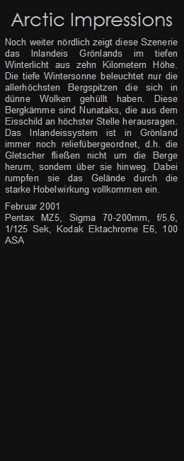 Noch weiter nördlich zeigt diese Szenerie das Inlandeis Grönlands im tiefen Winterlicht aus zehn Kilometern Höhe. Die tiefe Wintersonne beleuchtet nur die allerhöchsten Bergspitzen die sich in dünne Wolken gehüllt haben. Diese Bergkämme sind Nunataks, die aus dem Eisschild an höchster Stelle herausragen. Das Inlandeissystem ist in Grönland immer noch reliefübergeordnet, d.h. die Gletscher fließen nicht um die Berge herum, sondern über sie hinweg. Dabei rumpfen sie das Gelände durch die starke Hobelwirkung vollkommen ein.
