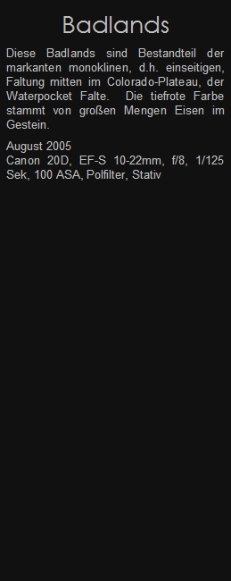 Diese Badlands sind Bestandteil der markanten monoklinen, d.h. einseitigen, Faltung mitten im Colorado-Plateau, der Waterpocket Falte. Die tiefrote Farbe stammt von großen Mengen Eisen im Gestein.