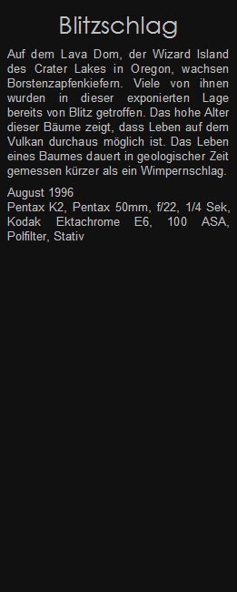 Auf dem Lava Dom, der Wizard Island des Crater Lakes in Oregon, wachsen Borstenzapfenkiefern. Viele von ihnen wurden in dieser exponierten Lage bereits von Blitz getroffen. Das hohe Alter dieser Bäume zeigt, dass Leben auf dem Vulkan durchaus möglich ist. Das Leben eines Baumes dauert in geologischer Zeit gemessen kürzer als ein Wimpernschlag.