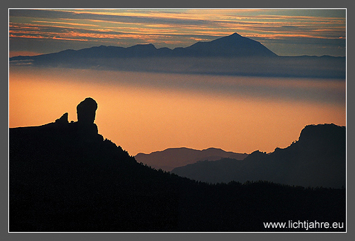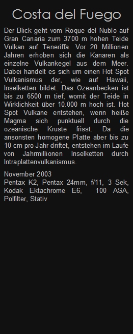 Der Blick geht vom Roque del Nublo auf Gran Canaria zum 3700 m hohen Teide Vulkan auf Teneriffa. Vor 20 Millionen Jahren erhoben sich die Kanaren als einzelne Vulkankegel aus dem Meer. Dabei handelt es sich um einen Hot Spot Vulkanismus der, wie auf Hawaii, Inselketten bildet. Das Ozeanbecken ist bis zu 6500 m tief, womit der Teide in Wirklichkeit über 10.000 m hoch ist. Hot Spot Vulkane entstehen, wenn heiße Magma sich punktuell durch die ozeanische Kruste frisst. Da die ansonsten homogene Platte aber bis zu 10 cm pro Jahr driftet, entstehen im Laufe von Jahrmillionen Inselketten durch Intraplattenvulkanismus.