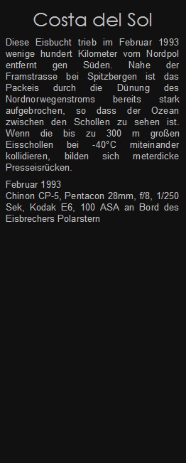 Diese Eisbucht trieb im Februar 1993 wenige hundert Kilometer vom Nordpol entfernt gen Süden. Nahe der Framstrasse bei Spitzbergen ist das Packeis durch die Dünung des Nordnorwegenstroms bereits stark aufgebrochen, so dass der Ozean zwischen den Schollen zu sehen ist. Wenn die bis zu 300 m großen Eisschollen bei -40°C miteinander kollidieren, bilden sich meterdicke Presseisrücken.