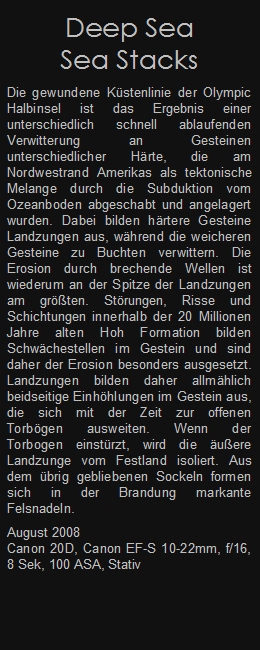 Die gewundene Küstenlinie der Olympic Halbinsel ist das Ergebnis einer unterschiedlich schnell ablaufenden Verwitterung an Gesteinen unterschiedlicher Härte, die am Nordwestrand Amerikas als tektonische Melange durch die Subduktion vom Ozeanboden abgeschabt und angelagert wurden. Dabei bilden härtere Gesteine Landzungen aus, während die weicheren Gesteine zu Buchten verwittern. Die Erosion durch brechende Wellen ist wiederum an der Spitze der Landzungen am größten. Störungen, Risse und Schichtungen innerhalb der 20 Millionen Jahre alten Hoh Formation bilden Schwächestellen im Gestein und sind daher der Erosion besonders ausgesetzt. Landzungen bilden daher allmählich beidseitige Einhöhlungen im Gestein aus, die sich mit der Zeit zur offenen Torbögen ausweiten. Wenn der Torbogen einstürzt, wird die äußere Landzunge vom Festland isoliert. Aus dem übrig gebliebenen Sockeln formen sich in der Brandung markante Felsnadeln.