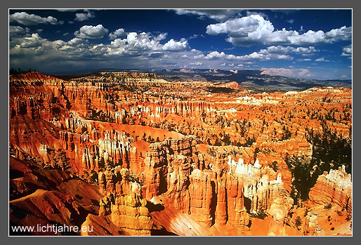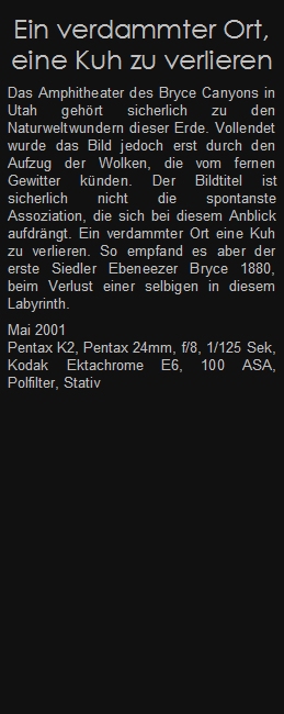 Das Amphitheater des Bryce Canyons in Utah gehört sicherlich zu den Naturweltwundern dieser Erde. Vollendet wurde das Bild jedoch erst durch den Aufzug der Wolken, die vom fernen Gewitter künden. Der Bildtitel ist sicherlich nicht die spontanste Assoziation, die sich bei diesem Anblick aufdrängt. Ein verdammter Ort eine Kuh zu verlieren. So empfand es aber der erste Siedler Ebeneezer Bryce 1880, beim Verlust einer selbigen in diesem Labyrinth.