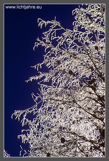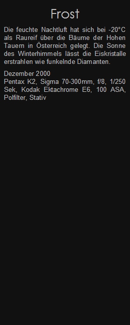 Die feuchte Nachtluft hat sich bei -20°C als Raureif über die Bäume der Hohen Tauern in Österreich gelegt. Die Sonne des Winterhimmels lässt die Eiskristalle erstrahlen wie funkelnde Diamanten.