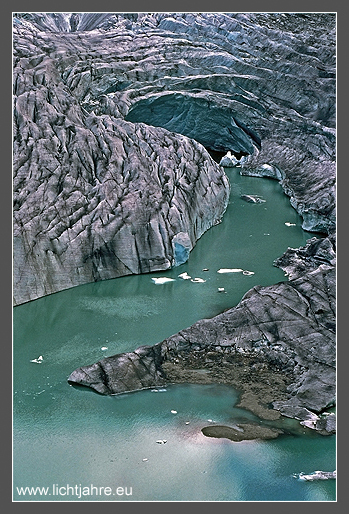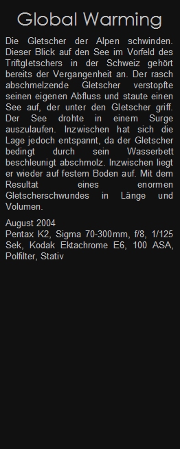 Die Gletscher der Alpen schwinden. Dieser Blick auf den See im Vorfeld des Triftgletschers in der Schweiz gehört bereits der Vergangenheit an. Der rasch abschmelzende Gletscher verstopfte seinen eigenen Abfluss und staute einen See auf, der unter den Gletscher griff. Der See drohte in einem Surge auszulaufen. Inzwischen hat sich die Lage jedoch entspannt, da der Gletscher bedingt durch sein Wasserbett beschleunigt abschmolz. Inzwischen liegt er wieder auf festem Boden auf. Mit dem Resultat eines enormen Gletscherschwundes in Länge und Volumen.