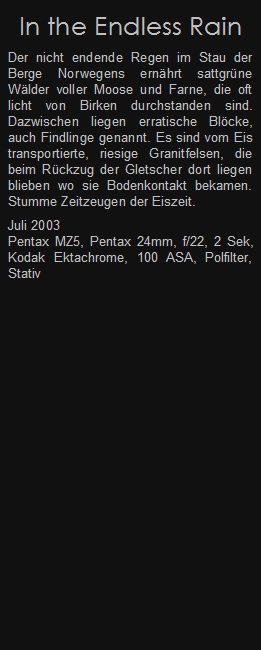 Der nicht endende Regen im Stau der Berge Norwegens ernährt sattgrüne Wälder voller Moose und Farne, die oft licht von Birken durchstanden sind. Dazwischen liegen erratische Blöcke, auch Findlinge genannt. Es sind vom Eis transportierte, riesige Granitfelsen, die beim Rückzug der Gletscher dort liegen blieben wo sie Bodenkontakt bekamen. Stumme Zeitzeugen der Eiszeit.