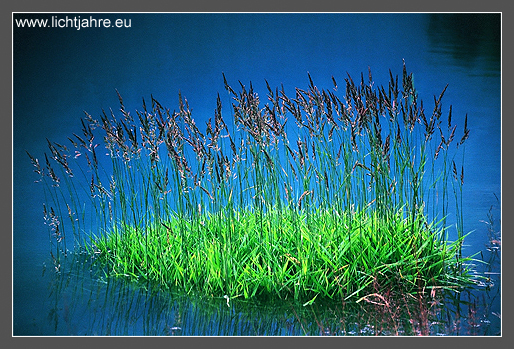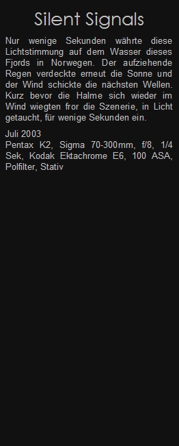 Nur wenige Sekunden währte diese Lichtstimmung auf dem Wasser dieses Fjords in Norwegen. Der aufziehende Regen verdeckte erneut die Sonne und der Wind schickte die nächsten Wellen. Kurz bevor die Halme sich wieder im Wind wiegten fror die Szenerie, in Licht getaucht, für wenige Sekunden ein.
