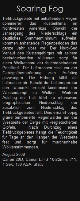 Tiefdruckgebiete mit anhaltendem Regen dominieren das Küstenklima im Nordwesten Amerikas. Obwohl der Jahresgang des Niederschlags ein deutliches Sommerminimum aufweist, kommen anhaltende Regenperioden das ganze Jahr über vor. Der Nord-Süd Verlauf des Küstengebirges mit seinem beeindruckenden Vulkanen sorgt für einen Wolkenstau der feuchtebeladenen Pazifikluft. Die Luftmassen sind vor der Gebirgsüberströmung zum Aufstieg gezwungen. Die Hebung kühlt die Luftmasse ab. Sobald die Lufttemperatur den Taupunkt erreicht kondensiert der Wasserdampf zu Wolken. Weiterer Aufstieg der Luft führt zu intensivem orographischen Niederschlag der zusätzlich zum Niederschlag des Tiefdruckgebietes fällt. Dies ernährt üppig grüne temperierte Regenwälder auf der Westseite der Berge mit vergletscherten Gipfeln. Nach Durchzug eines Tiefdruckgebietes hängt die Feuchtigkeit für Tage an den Hängen der Westseite fest und sorgt für märchenhafte Wolkenstimmungen.