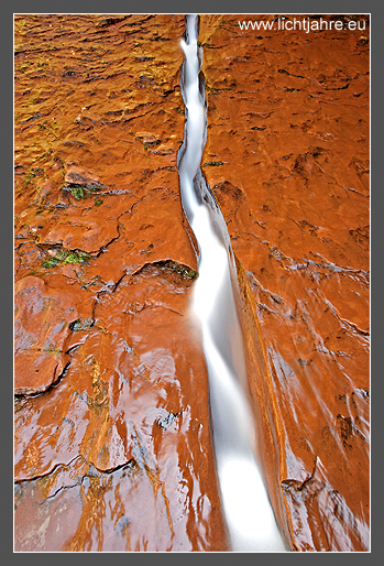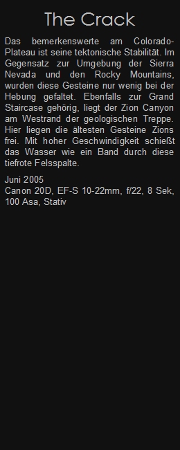 Das bemerkenswerte am Colorado-Plateau ist seine tektonische Stabilität. Im Gegensatz zur Umgebung der Sierra Nevada und den Rocky Mountains, wurden diese Gesteine nur wenig bei der Hebung gefaltet. Ebenfalls zur Grand Staircase gehörig, liegt der Zion Canyon am Westrand der geologischen Treppe. Hier liegen die ältesten Gesteine Zions frei. Mit hoher Geschwindigkeit schießt das Wasser wie ein Band durch diese tiefrote Felsspalte.