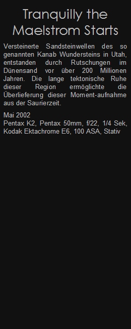 Versteinerte Sandsteinwellen des so genannten Kanab Wundersteins in Utah, entstanden durch Rutschungen im Dünensand vor über 200 Millionen Jahren. Die lange tektonische Ruhe dieser Region ermöglichte die Überlieferung dieser Moment-aufnahme aus der Saurierzeit.