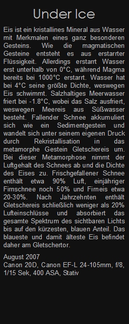 Eis ist ein kristallines Mineral aus Wasser mit Merkmalen eines ganz besonderen Gesteins. Wie die magmatischen Gesteine entsteht es aus erstarrter Flüssigkeit. Allerdings erstarrt Wasser erst unterhalb von 0°C, während Magma bereits bei 1000°C erstarrt. Wasser hat bei 4°C seine größte Dichte, weswegen Eis schwimmt. Salzhaltiges Meerwasser friert bei -1.8°C, wobei das Salz ausfriert, weswegen Meereis aus Süßwasser besteht. Fallender Schnee akkumuliert sich wie ein Sedimentgestein und wandelt sich unter seinem eigenen Druck durch Rekristallisation in das metamorphe Gestein Gletschereis um. Bei dieser Metamorphose nimmt der Luftgehalt des Schnees ab und die Dichte des Eises zu. Frischgefallener Schnee enthält etwa 90% Luft, einjähriger Firnschnee noch 50% und Firneis etwa 20-30%. Nach Jahrzehnten enthält Gletschereis schließlich weniger als 20% Lufteinschlüsse und absorbiert das gesamte Spektrum des sichtbaren Lichts bis auf den kürzesten, blauen Anteil. Das blaueste und damit älteste Eis befindet daher am Gletschertor.