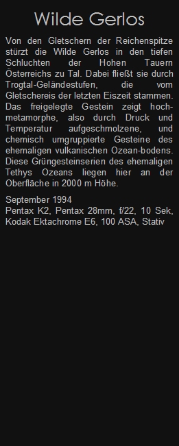 Von den Gletschern der Reichenspitze stürzt die Wilde Gerlos in den tiefen Schluchten der Hohen Tauern Österreichs zu Tal. Dabei fließt sie durch Trogtal-Geländestufen, die vom Gletschereis der letzten Eiszeit stammen. Das freigelegte Gestein zeigt hoch-metamorphe, also durch Druck und Temperatur aufgeschmolzene, und chemisch umgruppierte Gesteine des ehemaligen vulkanischen Ozean-bodens. Diese Grüngesteinserien des ehemaligen Tethys Ozeans liegen hier an der Oberfläche in 2000 m Höhe.