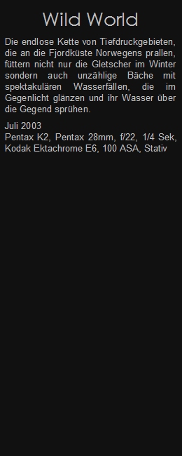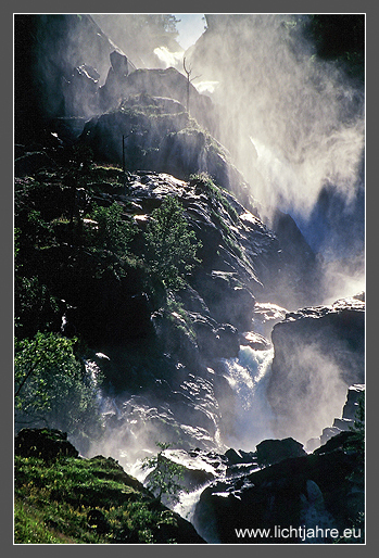 Die endlose Kette von Tiefdruckgebieten, die an die Fjordküste Norwegens prallen, füttern nicht nur die Gletscher im Winter sondern auch unzählige Bäche mit spektakulären Wasserfällen, die im Gegenlicht glänzen und ihr Wasser über die Gegend sprühen.