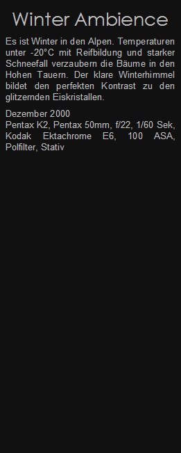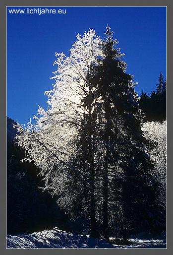 Es ist Winter in den Alpen. Temperaturen unter -20°C mit Reifbildung und starker Schneefall verzaubern die Bäume in den Hohen Tauern. Der klare Winterhimmel bildet den perfekten Kontrast zu den glitzernden Eiskristallen.