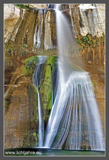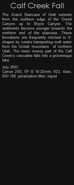 The Grand Staircase of Utah extends from the northern edge of the Grand Canyon up to Bryce Canyon. The sediments become younger towards the northern end of the staircase. These formations are frequently notched to V-shapes by creeks transporting melt water from the Uintah mountains of northern Utah. The lower mossy part of the Calf Creek’s cascades falls into a picturesque lake.