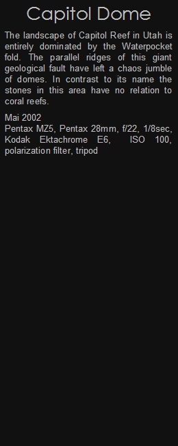 The landscape of Capitol Reef in Utah is entirely dominated by the Waterpocket fold. The parallel ridges of this giant geological fault have left a chaos jumble of domes. In contrast to its name the stones in this area have no relation to coral reefs.