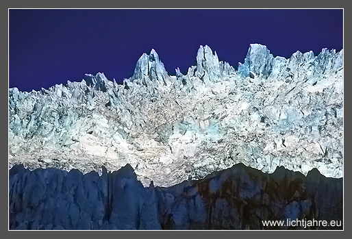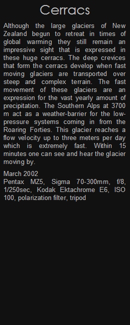 Although the large glaciers of New Zealand begun to retreat in times of global warming they still remain an impressive sight that is expressed in these huge cerracs. The deep crevices that form the cerracs develop when fast moving glaciers are transported over steep and complex terrain. The fast movement of these glaciers are an expression for the vast yearly amount of precipitation. The Southern Alps at 3700 m act as a weather-barrier for the low-pressure systems coming in from the Roaring Forties. This glacier reaches a flow velocity up to three meters per day which is extremely fast. Within 15 minutes one can see and hear the glacier moving by.