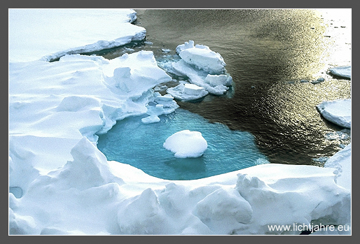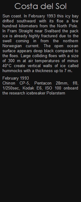 Sun coast. In February 1993 this icy bay drifted southward with its floe a few hundred kilometers from the North Pole. In Fram Straight near Svalbard the pack ice is already highly fractured due to the swell coming in from the northern Norwegian current. The open ocean surface appears deep black compared to the floes. Large colliding floes with a size of 300 m at air temperatures of minus 40°C create vertical walls of ice called hummocks with a thickness up to 7 m.