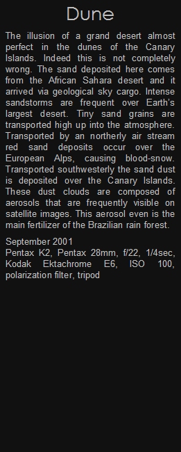The illusion of a grand desert almost perfect in the dunes of the Canary Islands. Indeed this is not completely wrong. The sand deposited here comes from the African Sahara desert and it arrived via geological sky cargo. Intense sandstorms are frequent over Earth’s largest desert. Tiny sand grains are transported high up into the atmosphere. Transported by an northerly air stream red sand deposits occur over the European Alps, causing blood-snow. Transported southwesterly the sand dust is deposited over the Canary Islands. These dust clouds are composed of aerosols that are frequently visible on satellite images. This aerosol even is the main fertilizer of the Brazilian rain forest.