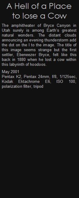 The amphitheater of Bryce Canyon in Utah surely is among Earth’s greatest natural wonders. The distant clouds announcing an evening thunderstorm add the dot on the I to the image. The title of this image seems strange but the first settler, Ebeneezer Bryce, felt like this back in 1880 when he lost a cow within this labyrinth of hoodoos.