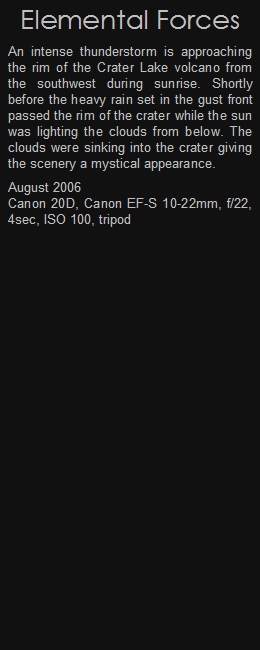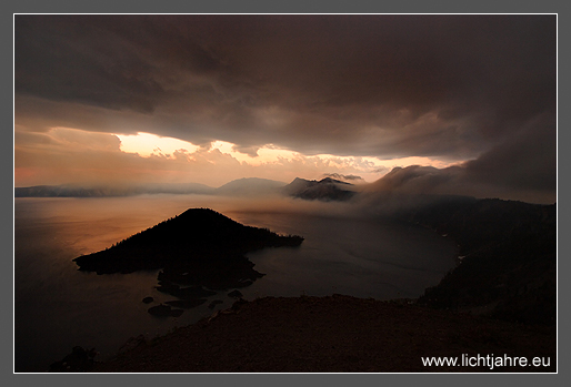 An intense thunderstorm is approaching the rim of the Crater Lake volcano from the southwest during sunrise. Shortly before the heavy rain set in the gust front passed the rim of the crater while the sun was lighting the clouds from below. The clouds were sinking into the crater giving the scenery a mystical appearance.