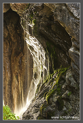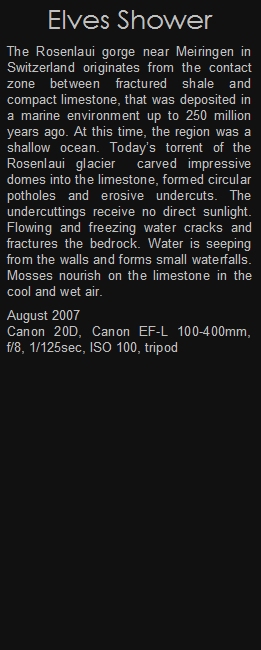 The Rosenlaui gorge near Meiringen in Switzerland originates from the contact zone between fractured shale and compact limestone, that was deposited in a marine environment up to 250 million years ago. At this time, the region was a shallow ocean. Today’s torrent of the Rosenlaui glacier carved impressive domes into the limestone, formed circular potholes and erosive undercuts. The undercuttings receive no direct sunlight. Flowing and freezing water cracks and fractures the bedrock. Water is seeping from the walls and forms small waterfalls. Mosses nourish on the limestone in the cool and wet air.