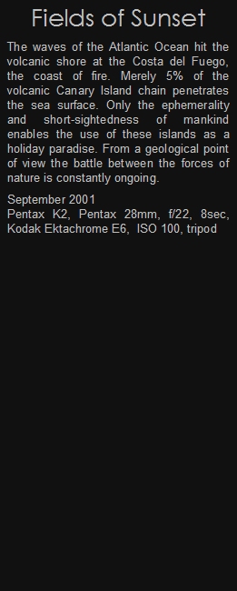The waves of the Atlantic Ocean hit the volcanic shore at the Costa del Fuego, the coast of fire. Merely 5% of the volcanic Canary Island chain penetrates the sea surface. Only the ephemerality and short-sightedness of mankind enables the use of these islands as a holiday paradise. From a geological point of view the battle between the forces of nature is constantly ongoing.
