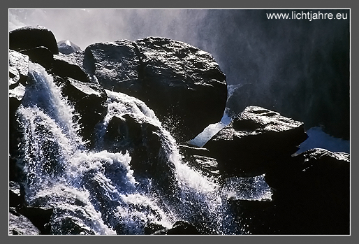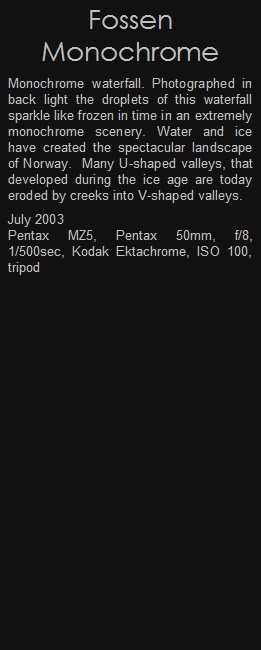 Monochrome waterfall. Photographed in back light the droplets of this waterfall sparkle like frozen in time in an extremely monochrome scenery. Water and ice have created the spectacular landscape of Norway. Many U-shaped valleys, that developed during the ice age are today eroded by creeks into V-shaped valleys.