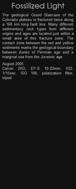 The geological Grand Staircase of the Colorado plateau is fractured twice along a 160 km long fault line. Many different sedimentary rock types from different origins and ages are located just within a small area of this fracture zone. The contact zone between the red and yellow sediments marks the geological boundary between dunes of Permian age and a marginal sea from the Jurassic age.