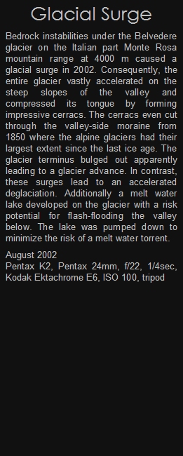 Bedrock instabilities under the Belvedere glacier on the Italian part Monte Rosa mountain range at 4000 m caused a glacial surge in 2002. Consequently, the entire glacier vastly accelerated on the steep slopes of the valley and compressed its tongue by forming impressive cerracs. The cerracs even cut through the valley-side moraine from 1850 where the alpine glaciers had their largest extent since the last ice age. The glacier terminus bulged out apparently leading to a glacier advance. In contrast, these surges lead to an accelerated deglaciation. Additionally a melt water lake developed on the glacier with a risk potential for flash-flooding the valley below. The lake was pumped down to minimize the risk of a melt water torrent.