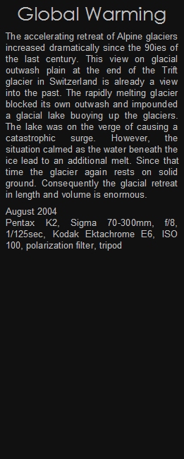 The accelerating retreat of Alpine glaciers increased dramatically since the 90ies of the last century. This view on glacial outwash plain at the end of the Trift glacier in Switzerland is already a view into the past. The rapidly melting glacier blocked its own outwash and impounded a glacial lake buoying up the glaciers. The lake was on the verge of causing a catastrophic surge. However, the situation calmed as the water beneath the ice lead to an additional melt. Since that time the glacier again rests on solid ground. Consequently the glacial retreat in length and volume is enormous.
