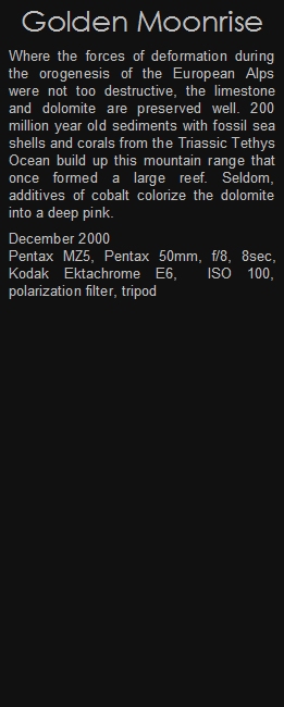 Where the forces of deformation during the orogenesis of the European Alps were not too destructive, the limestone and dolomite are preserved well. 200 million year old sediments with fossil sea shells and corals from the Triassic Tethys Ocean build up this mountain range that once formed a large reef. Seldom, additives of cobalt colorize the dolomite into a deep pink.