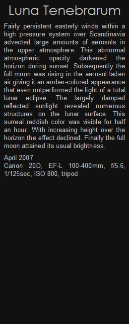 Fairly persistent easterly winds within a high pressure system over Scandinavia advected large amounts of aerosols in the upper atmosphere. This abnormal atmospheric opacity darkened the horizon during sunset. Subsequently the full moon was rising in the aerosol laden air giving it an amber-colored appearance that even outperformed the light of a total lunar eclipse. The largely damped reflected sunlight revealed numerous structures on the lunar surface. This surreal reddish color was visible for half an hour. With increasing height over the horizon the effect declined. Finally the full moon attained its usual brightness.
