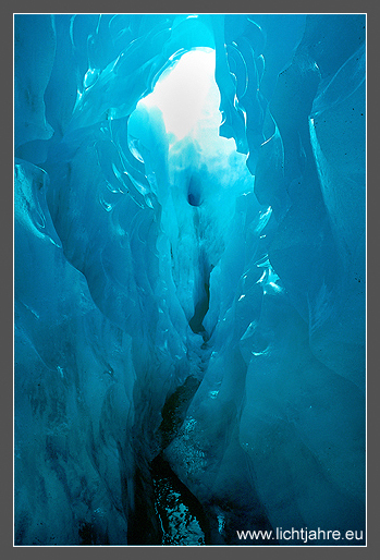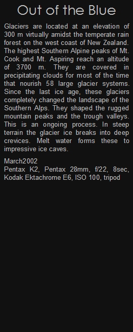Glaciers are located at an elevation of 300 m virtually amidst the temperate rain forest on the west coast of New Zealand. The highest Southern Alpine peaks of Mt. Cook and Mt. Aspiring reach an altitude of 3700 m. They are covered in precipitating clouds for most of the time that nourish 58 large glacier systems. Since the last ice age, these glaciers completely changed the landscape of the Southern Alps. They shaped the rugged mountain peaks and the trough valleys. This is an ongoing process. In steep terrain the glacier ice breaks into deep crevices. Melt water forms these to impressive ice caves.
