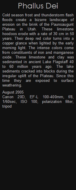 Cold season frost and thunderstorm flash floods create a bizarre landscape of erosion on the brink of the Paunsaugunt Plateau in Utah. These limestone hoodoos erode with a rate of 30 cm in 50 years. Their deep red color turns into a copper glance when lighted by the early morning light. The intense colors come from constituents of iron and manganese oxide. These limestone and clay was sedimented in ancient Lake Flagstaff 40 to 60 million years ago. The lake sediments cracked into blocks during the irregular uplift of the Plateau. Since this time they are exposed to surface weathering.
