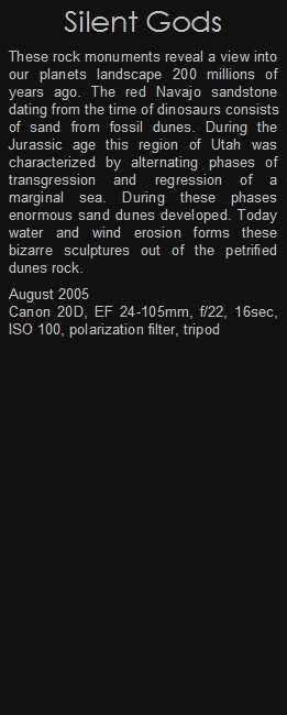These rock monuments reveal a view into our planets landscape 200 millions of years ago. The red Navajo sandstone dating from the time of dinosaurs consists of sand from fossil dunes. During the Jurassic age this region of Utah was characterized by alternating phases of transgression and regression of a marginal sea. During these phases enormous sand dunes developed. Today water and wind erosion forms these bizarre sculptures out of the petrified dunes rock.