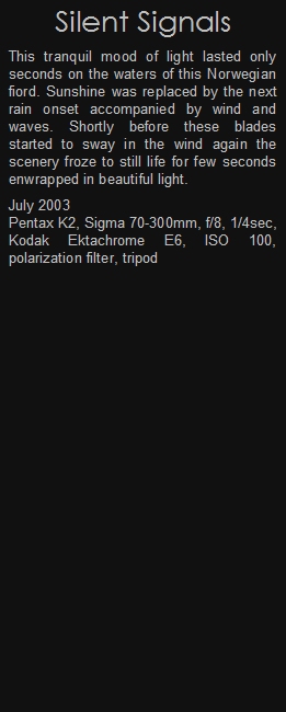 This tranquil mood of light lasted only seconds on the waters of this Norwegian fiord. Sunshine was replaced by the next rain onset accompanied by wind and waves. Shortly before these blades started to sway in the wind again the scenery froze to still life for few seconds enwraped in beautiful light.