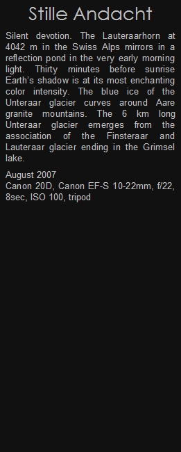 Silent devotion. The Lauteraarhorn at 4042 m in the Swiss Alps mirrors in a reflection pond in the very early morning light. Thirty minutes before sunrise Earth’s shadow is at its most enchanting color intensity. The blue ice of the Unteraar glacier curves around Aare granite mountains. The 6 km long Unteraar glacier emerges from the association of the Finsteraar and Lauteraar glacier ending in the Grimsel lake.