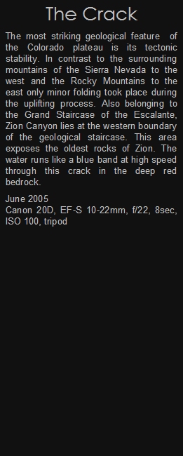 The most striking geological feature of the Colorado plateau is its tectonical stability. In contrast to the surrounding mountains of the Sierra Nevada to the west and the Rocky Mountains to the east only minor folding took place during the uplifting process. Also belonging to the Grand Staircase of the Escalente, Zion Canyon lies at the western boundary of the geological staircase. This area exposes the oldest rocks of Zion. The water runs like a blue band at high speed through this crack in the deep red bedrock.