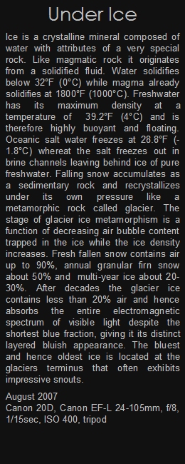 Ice is a crystalline mineral composed of water with attributes of a very special rock. Like magmatic rock it originates from a solidified fluid. Water solidifies below 32°F (0°C) while magma already solidifies at 1800°F (1000°C). Freshwater has its maximum density at a temperature of 39.2°F (4°C) and is therefore highly buoyant and floating. Oceanic salt water freezes at 28.8°F (-1.8°C) whereat the salt freezes out in brine channels leaving behind ice of pure freshwater. Falling snow accumulates as a sedimentary rock and recrystallizes under its own pressure like a metamorphic rock called glacier. The stage of glacier ice metamorphism is a function of decreasing air bubble content trapped in the ice while the ice density increases. Fresh fallen snow contains air up to 90%, annual granular firn snow about 50% and multi-year ice about 20-30%. After decades the glacier ice contains less than 20% air and hence absorbs the entire electromagnetic spectrum of visible light despite the shortest blue fraction, giving it its distinct layered bluish appearance. The bluest and hence oldest ice is located at the glaciers terminus that often exhibits impressive snouts.